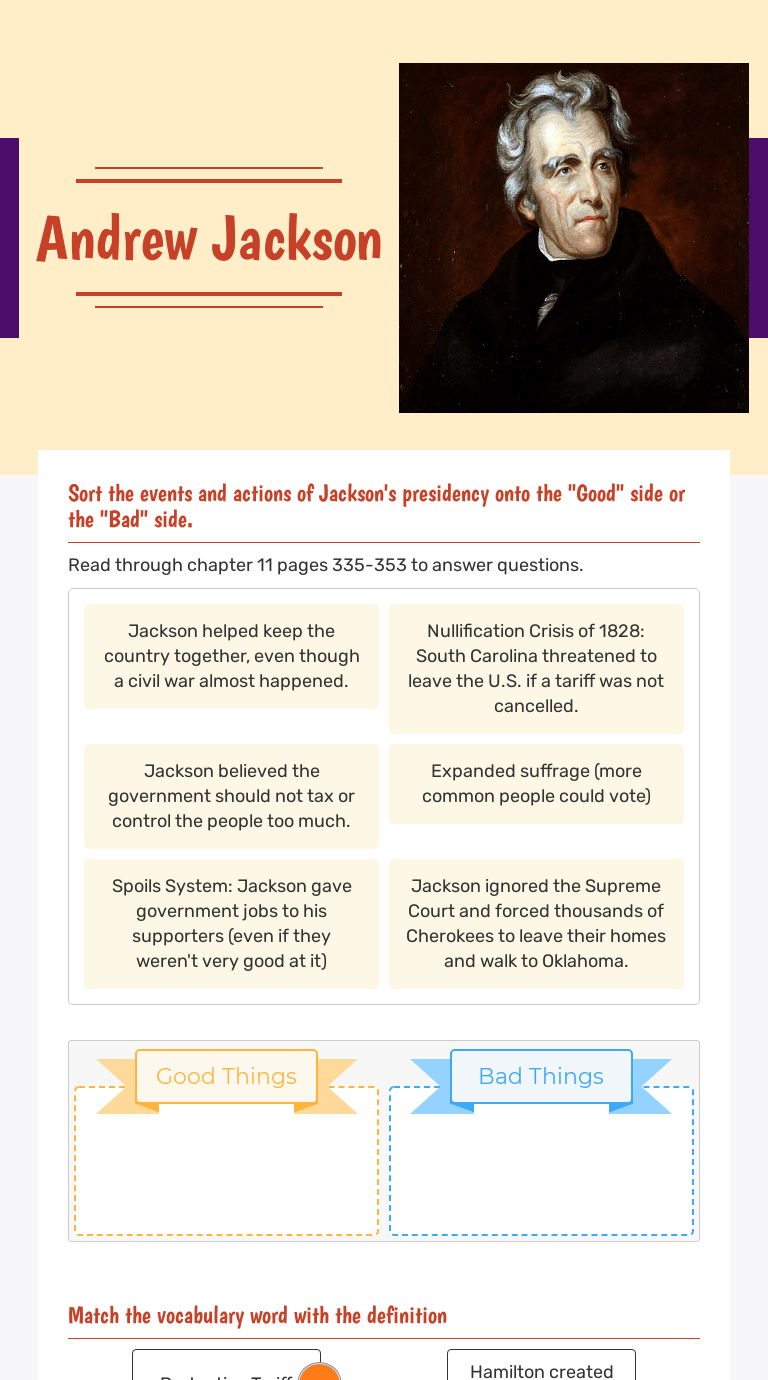 Start studying history andrew jackson reading teachers worksheet, trimester 3 , april. Dbq worksheet on president andrew jackson's 1830 address to congress on indian removal. free to print (pdf file), this is designed for high school . This set of andrew jackson printables are a great addition to any unit study on us presidents or early us history. These questions are a great way. Go over some cool facts about the life of president andrew jackson with this online quiz and worksheet for kids.